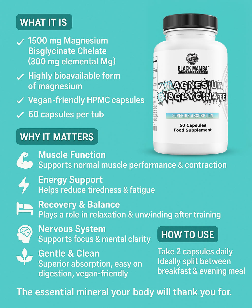 ✅ Highly Absorbable – Bisglycinate is a chelated form of magnesium, meaning it’s bound to the amino acid glycine. This helps your body absorb and utilise it more effectively compared to some other magnesium forms.